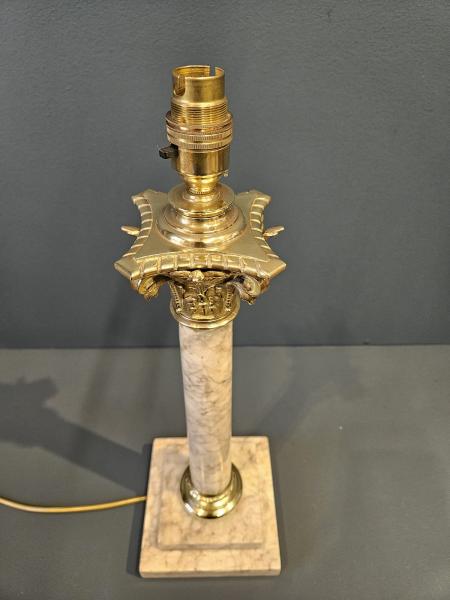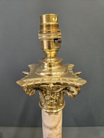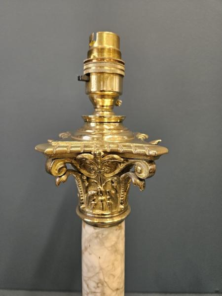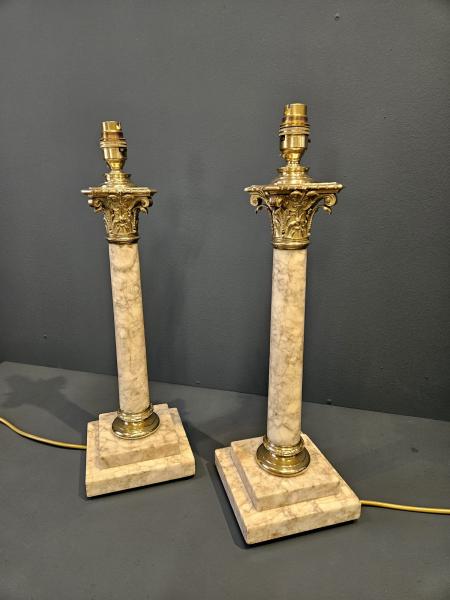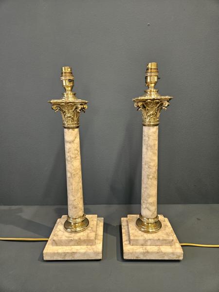 A matching pair of late Victorian marble table lamps with brass Corinthian mounts, fully rewired ready for use c.1900. Each matching lamp with off white veined marble stepped bases, brass mount above supporting the matching circular columns. Gilt brass Corinthian mounts to the top of each with switched brass lamp holders above. Both lamps fully rewired with gold covered flex, inline switch and fitted plug. Superb quality and both presented in excellent condition. Each measures 5.75" wide x 5.75" deep at the base x 19.25" high to top of the lamp holder. Stock number 43124.
