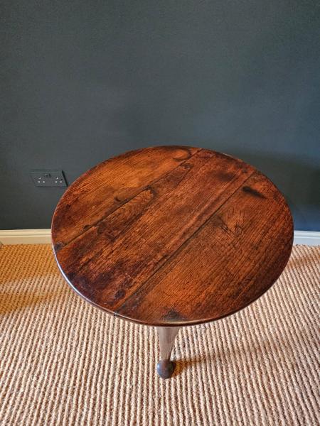 A superb George III elm pad foot cricket table with original colour and polish c.1780 Circular planked figured elm top sat over a deep supporting triangular top rail, which has tapering moulded legs with pad feet to the ends set to the corners. Pegged joints throughout, this table is presented in superb original condition with a rich colour and original patina. Very sturdy and usable. Measures 25.75" diameter x 27" high. Stock number 43075.