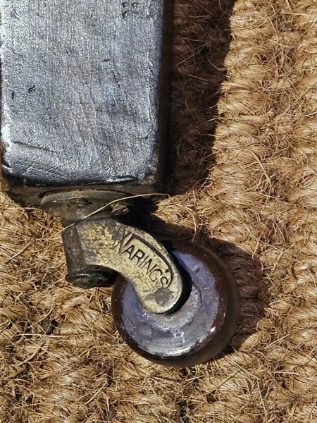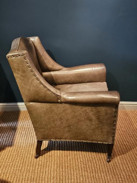 A top quality Edwardian armchair by Warings, London with superb patinated pale olive leather upholstery c.1905. Substantial frame with sprung back and seat base, tapering mahogany legs to the front and splayed legs to the rear; each with the original brass castors stamped Warings, plus serial number to the rear leg. The pale olive leather upholstery with tones of grey and has superb original patination.  The leatherwork includes piped edges and stud work trims with a removeable feather filled seat cushion. Immensely comfortable and presented in excellent damage free condition with a rich patina to the leather. Measures 30" wide x 28" deep x 38" high to top of chair back x 19.5" seat height.  Stock number 43211.