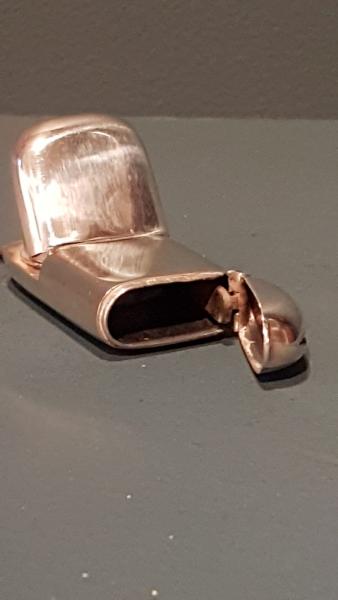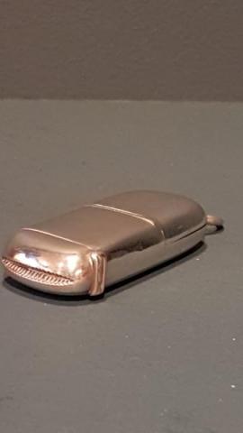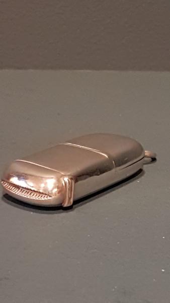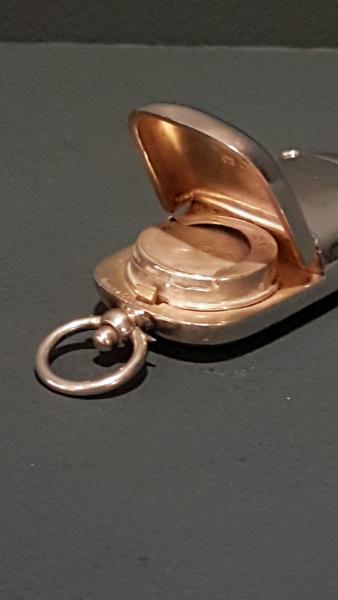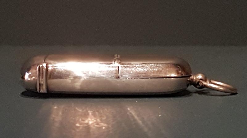 A Victorian silver double sided vesta and sovereign case, hallmarked Birmingham 1900. Hanging loop to the top with button release for the spring opening sovereign holder. Opens to reveal an engine turned panel to hold the full sovereign. The base with match striker to the cover, sprung opening to the match holder. Bears the makers mark for Deakin & Francis. Immaculate condition. Measures 3.5" long including the hanging loop x 1" wide x 0.5" deep. Stock Number 34073.
