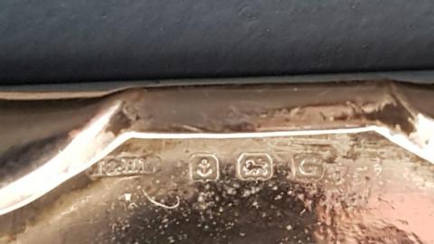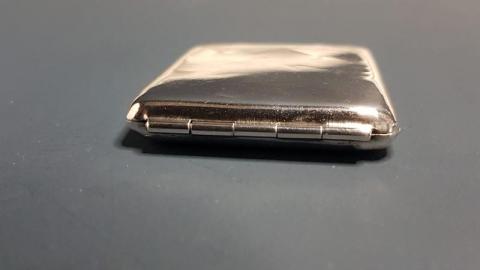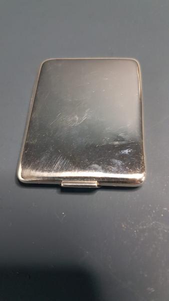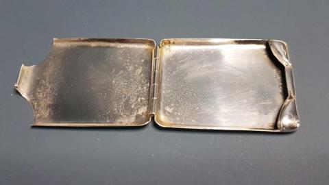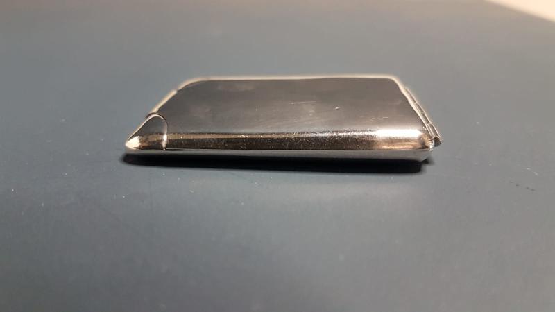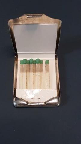 An unusual George V period solid silver vesta case designed to hold a hotel strip pack of matches, hallmarked Birmingham 1931. Oblong shaped with hinged lid, and tapering in depth to allow space for the match heads. Clasp to the front, opens to reveal a polished interior with indents to the corners to hold the match pack in place. Bears the makers mark for Hasset & Harper. Excellent condition with a deep shine. Measures 2.25" Long x 1.75" wide x 0.5" deep. Stock number 34391.